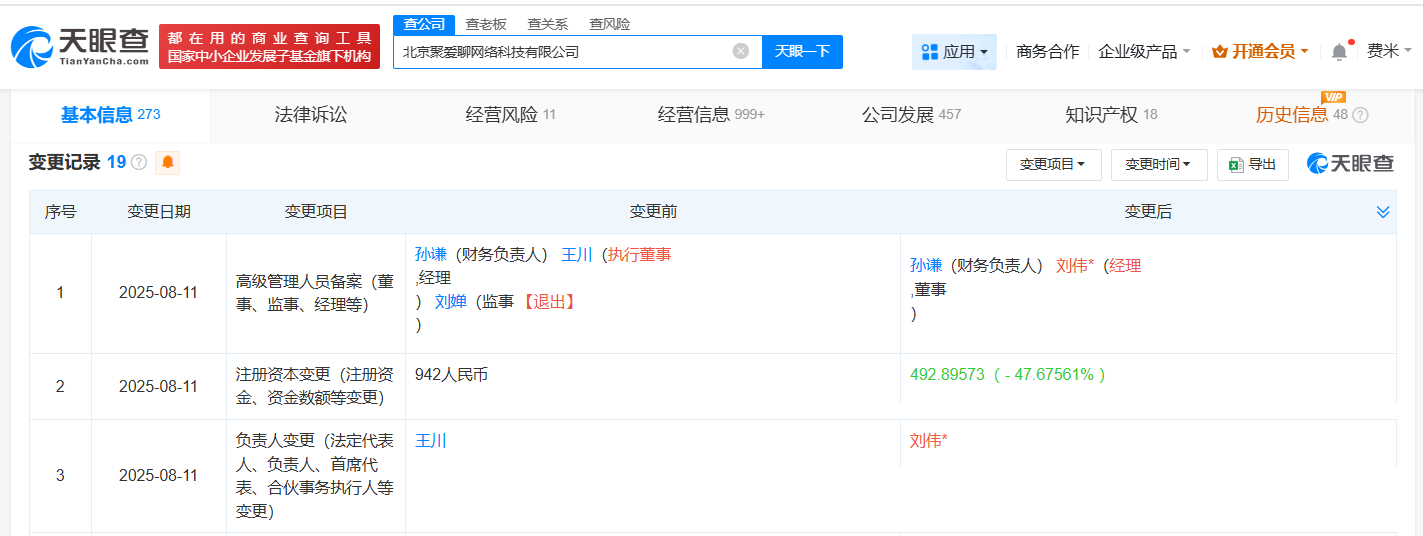 天眼查app显示,近日,北京聚爱聊网络科技有限公司发生工商变更,王川卸任法定代表人、执行董事、经理,由刘伟任法定代表人、经理、董事,同时该公司注册资本由942万人民币减至约493万人民币。