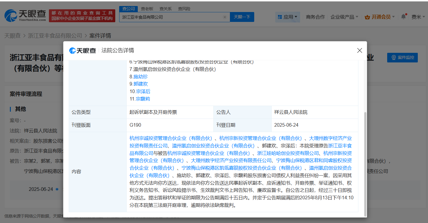 天眼查app显示,近期,祥云县人民法院公告送达原告浙江亚丰食品有限公司与被告宗馥莉母亲施幼珍、宗馥莉、宗馥莉叔叔宗泽后、浙江娃哈哈创业投资有限公司等股东损害公司债权人利益责任纠纷一案起诉状副本、开庭传票等,自公告发出之日起三十日即视为送达,该案定于8月13日下午14:10分在祥云县人民法院开庭审理。