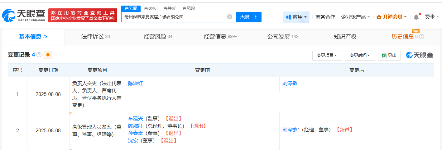 天眼查app显示,近日,常州世界家具家居广场有限公司发生工商变更,美凯龙创始人车建兴卸任该公司监事,陈淑红卸任法定代表人、董事长、总经理,刘泽敏接任法定代表人,并担任董事、经理。