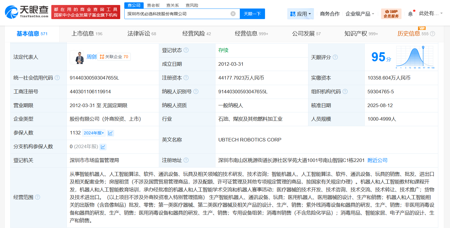 天眼查app显示,近日,优必选(09880.hk)发生工商变更,注册资本由约4.2亿人民币增至约4.4亿人民币,增幅约5%,同时,多位主要人员也发生变更。