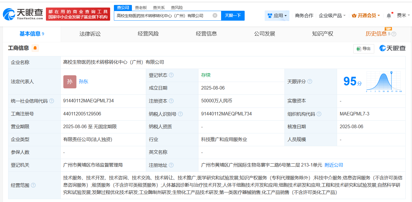 天眼查app显示,近日,高校生物医药技术转移转化中心(广州)有限公司成立,法定代表人为孙东,注册资本5亿人民币,经营范围包括医学研究和试验发展、知识产权服务、科技中介服务、信息咨询服务、租赁服务、人体基因诊断与治疗技术开发等。股东信息显示,该公司由广州医药集团有限公司全资持股。