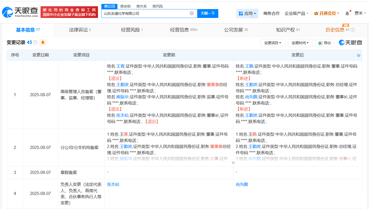 天眼查app显示,近日,山东友道化学有限公司发生工商变更,张本松卸任法定代表人、董事长,由尚先鹏接任,同时部分主要人员发生变更。