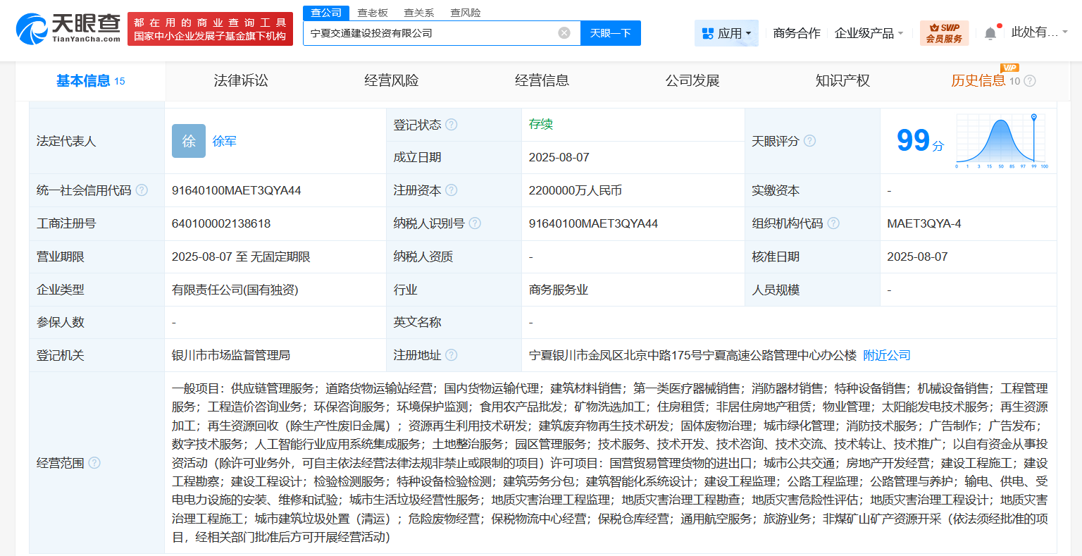 天眼查app显示,近日,宁夏交通建设投资有限公司成立,法定代表人为徐军,注册资本220亿人民币,经营范围含供应链管理服务、道路货物运输站经营、国内货物运输代理、建筑材料销售、工程管理服务、工程造价咨询业务、环境保护监测、太阳能发电技术服务、再生资源加工等。股东信息显示,该公司由宁夏回族自治区人民政府国有资产监督管理委员会全资持股。
