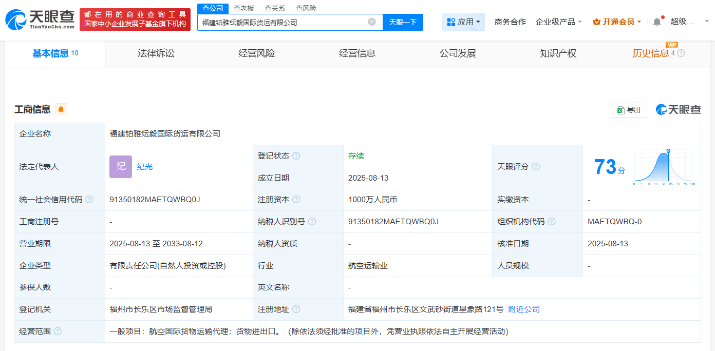 天眼查工商信息显示,近日,福建铂雅纭毅国际货运有限公司成立,法定代表人为纪光,注册资本1000万人民币,经营范围包括航空国际货物运输代理、货物进出口。股东信息显示,该公司由福州铂雅航空货运有限公司、极兔国际物流有限公司、新中冠智能科技股份有限公司共同持股。