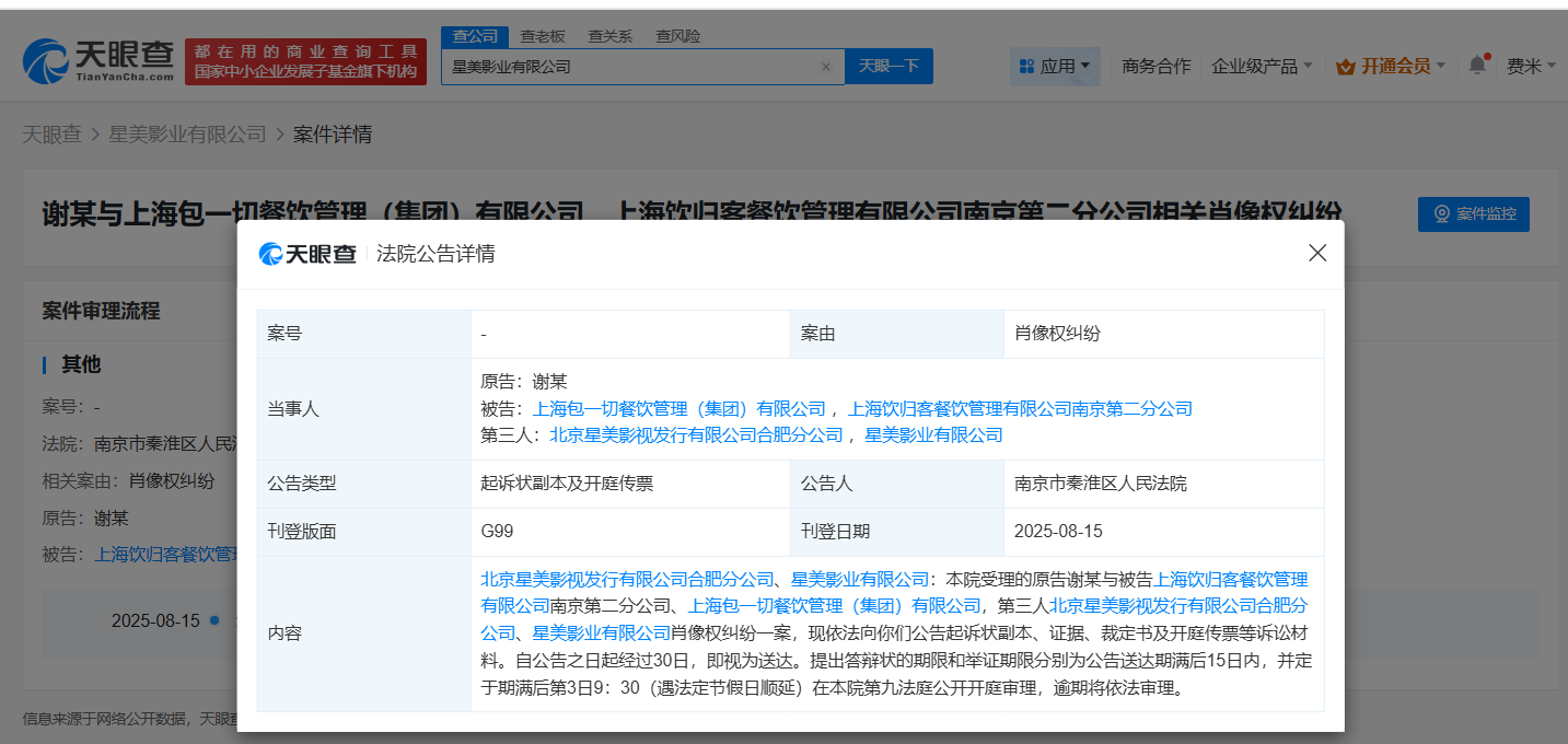 天眼查天眼风险信息显示,近日,南京市秦淮区人民法院向北京星美影视发行有限公司合肥分公司、星美影业有限公司公告送达原告谢霆锋与被告上海饮归客餐饮管理有限公司南京第二分公司、上海包一切餐饮管理(集团)有限公司肖像权纠纷一案的起诉状副本、开庭传票等,自公告之日起经过30日,即视为送达。该案提出答辩状的期限和举证期限为公告送达期满后15日内,并定于期满后第3日9:30开庭审理。