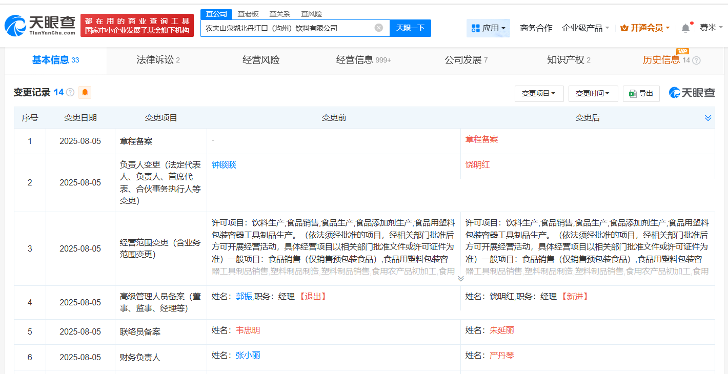 天眼查app显示,近日,农夫山泉湖北丹江口(均州)饮料有限公司发生工商变更,钟睒睒卸任法定代表人、郭振卸任经理,均由饶明红接任。