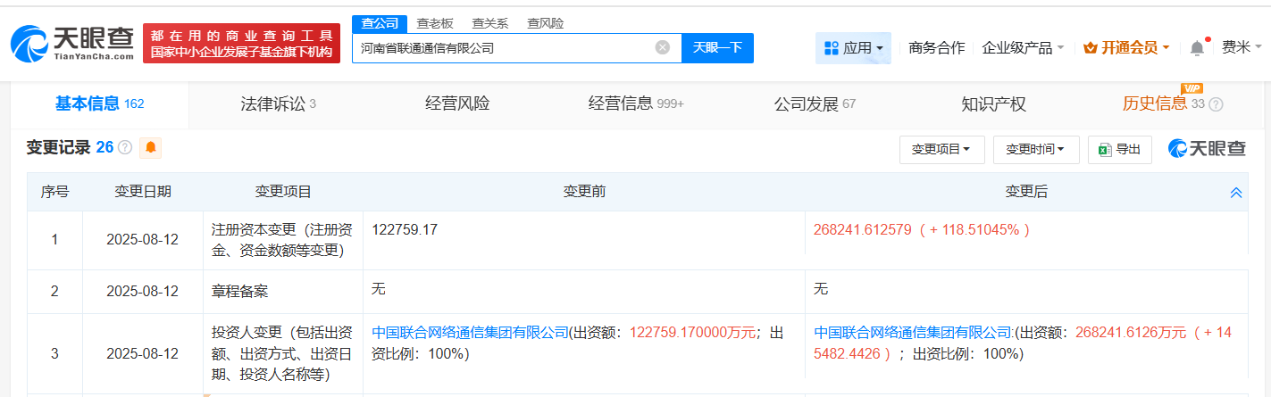 天眼查工商信息显示,近日,河南省联通通信有限公司发生工商变更,注册资本由约12.3亿人民币增至约26.8亿人民币,增幅约119%。