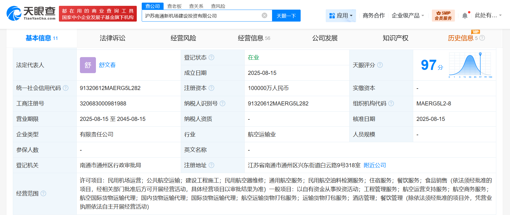 天眼查工商信息显示,近日,沪苏南通新机场建设投资有限公司成立,法定代表人为舒文春,注册资本10亿人民币,经营范围含民用机场运营、公共航空运输、建设工程施工、民用航空器维修、通用航空服务、民用航空油料检测服务、住宿服务、以自有资金从事投资活动等。股东信息显示,该公司由上海机场(集团)有限公司、南通城市建设集团有限公司共同持股。