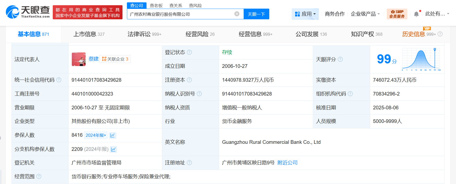 广州农村商业银行股份有限公司成立于2006年10月,法定代表人为蔡建,经营范围为货币银行服务、专业停车场服务、保险兼业代理。股东信息显示,该公司由广州金融控股集团有限公司、广州地铁集团有限公司、广州城市更新集团有限公司等共同持股。