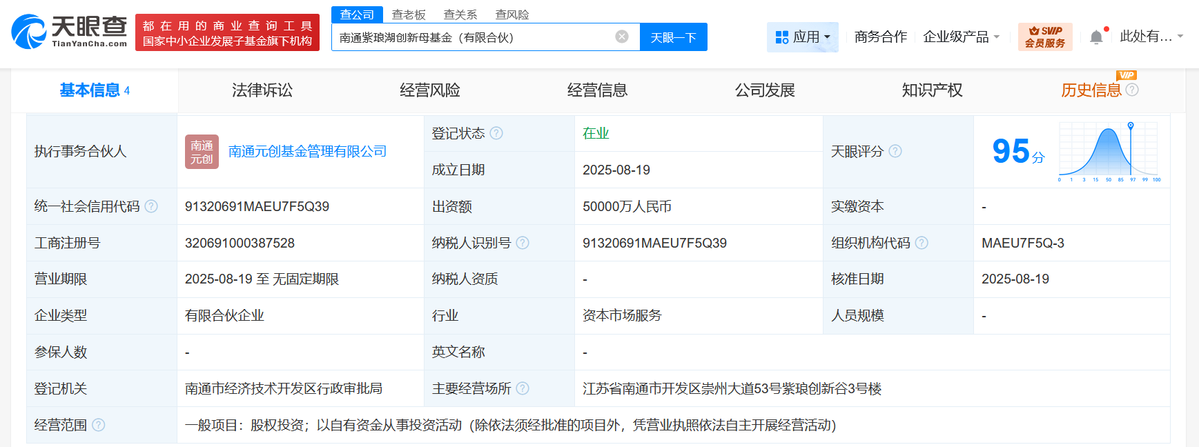 天眼查工商信息显示,近日,南通紫琅湖创新母基金(有限合伙)成立,执行事务合伙人为南通元创基金管理有限公司、南通新源创业投资管理有限公司,出资额5亿人民币,经营范围为股权投资、以自有资金从事投资活动。合伙人信息显示,该基金由南通元创科技投资有限公司、南通创新发展基金(有限合伙)、南通新源创业投资管理有限公司、南通元创基金管理有限公司出资。