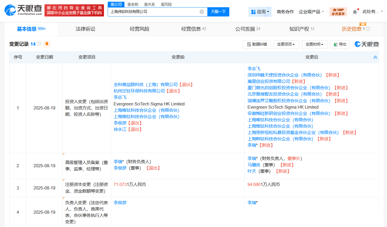 天眼查工商信息显示,近日,纬钛机器人关联公司上海纬钛科技有限公司发生工商变更,原股东李俊彦、杭州泛钛环保科技有限公司等退出,新增小米旗下瀚星创业投资有限公司以及厦门微光启创股权投资合伙企业(有限合伙)等为股东,注册资本由约71万人民币增至约95万人民币,李俊彦卸任法定代表人,由李瑞接任,同时,部分主要人员也发生变更。