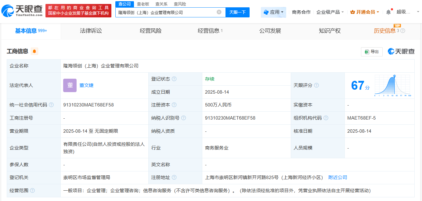 天眼查工商信息显示,近日,隆海领创(上海)企业管理有限公司成立,法定代表人为董文婕,注册资本500万人民币,经营范围包括企业管理、企业管理咨询、信息咨询服务。股东信息显示,该公司由天海防务(300008)全资持股。