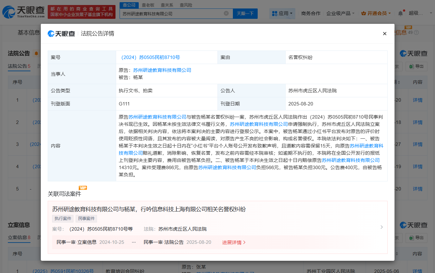 天眼查天眼风险信息显示,近日,因杨某某未履行义务,苏州研途教育科技有限公司申请强制执行,苏州市虎丘区人民法院登报公示研途教育与杨某某名誉权纠纷一案判决的主要内容。公告显示,法院判决杨某某在其小红书个人账号公开发布致歉声明,赔偿研途教育公司1.4万余元。