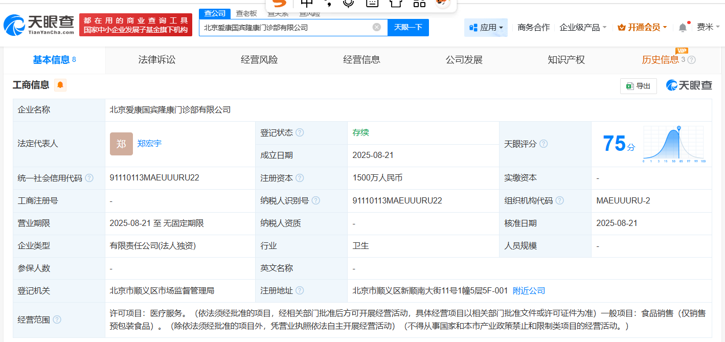 天眼查工商信息显示,近日,北京爱康国宾隆康门诊部有限公司成立,法定代表人为郑宏宇,注册资本1500万人民币,经营范围为医疗服务、食品销售。股东信息显示,该公司由爱康国宾健康体检管理集团有限公司全资持股。