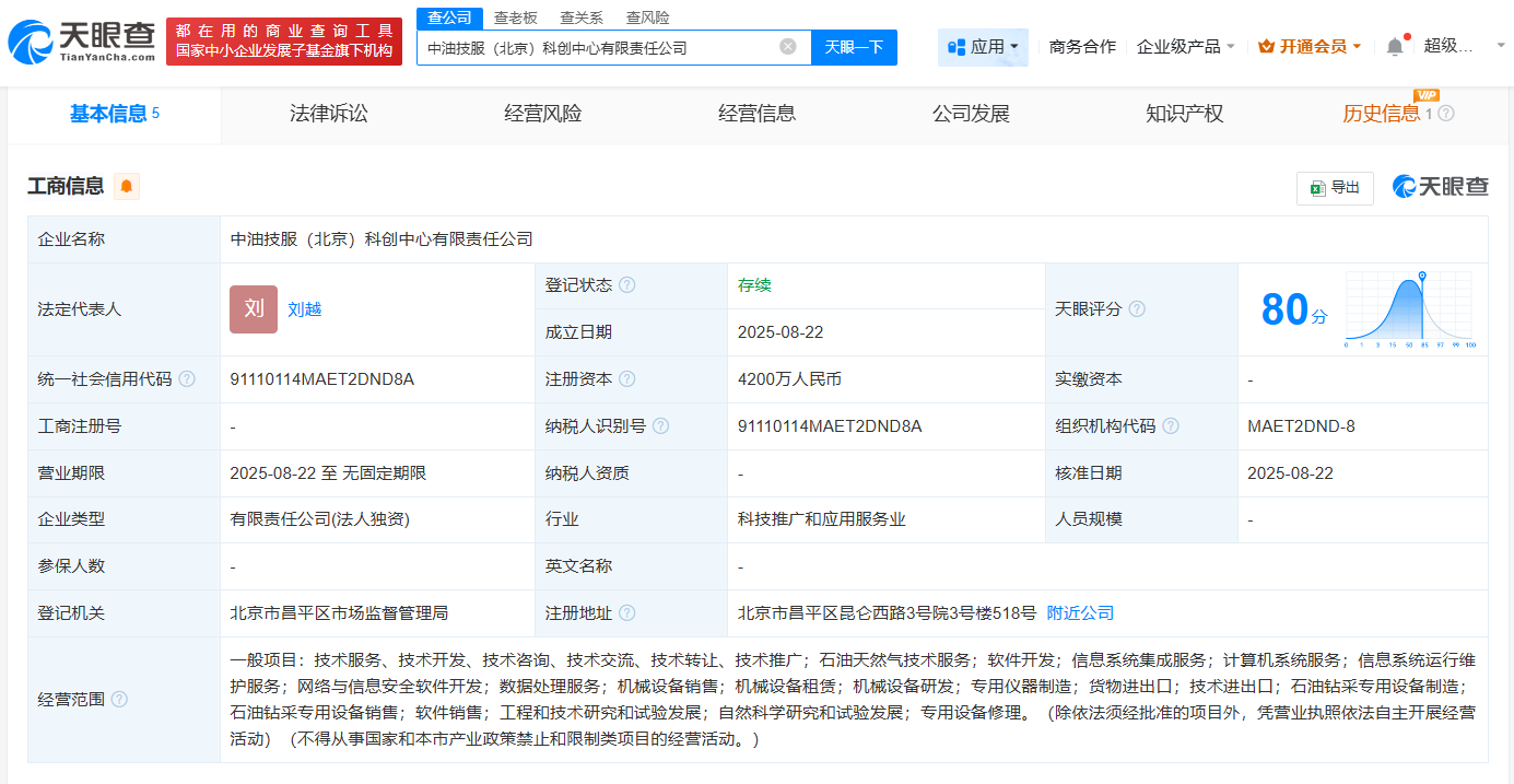 天眼查工商信息显示,近日,中油技服(北京)科创中心有限责任公司成立,法定代表人为刘越,注册资本4200万人民币,经营范围包括石油天然气技术服务、网络与信息安全软件开发、数据处理服务、工程和技术研究和试验发展等。股东信息显示,该公司由中国石油集团油田技术服务有限公司全资持股。
