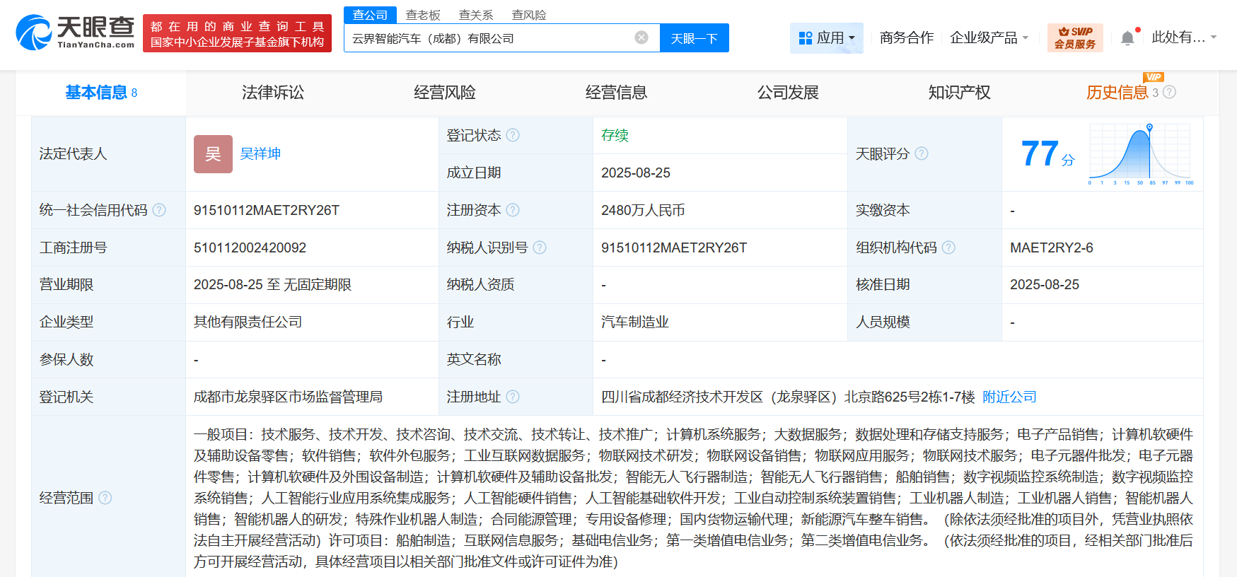 天眼查工商信息显示,近日,云界智能汽车(成都)有限公司成立,法定代表人为吴祥坤,注册资本2480万人民币,经营范围含计算机系统服务、大数据服务、数据处理和存储支持服务、智能无人飞行器销售、船舶销售、人工智能行业应用系统集成服务、人工智能硬件销售、人工智能基础软件开发、智能机器人的研发等。股东信息显示,该公司由深圳康湖新能源交通发展有限公司、四川野马汽车股份有限公司、中创投资(广东)集团有限公司、四川华鸿智造科技有限公司等共同持股。