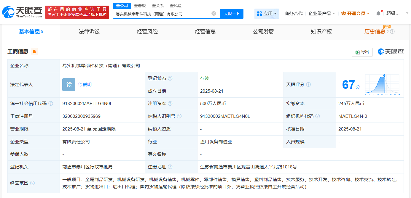 天眼查工商信息显示,近日,易实机械零部件科技(南通)有限公司成立,法定代表人为徐爱明,注册资本500万人民币,经营范围包括金属制品研发、机械设备研发、机械设备销售等。股东信息显示,该公司由易实精密(836221)等共同持股。