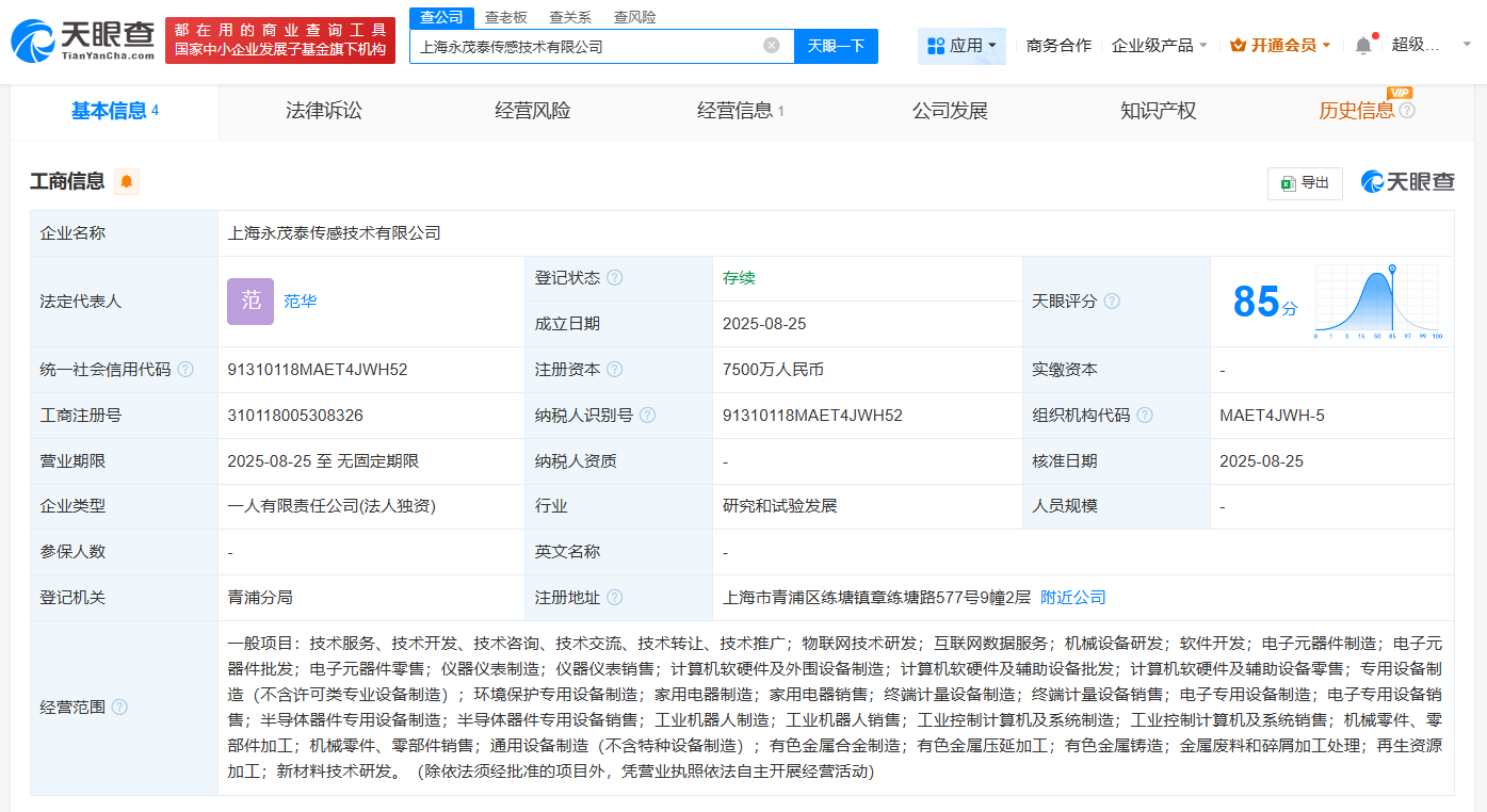 天眼查app显示,近日,上海永茂泰机器人科技有限公司、上海永茂泰传感技术有限公司成立,法定代表人均为范华,注册资本7500万人民币,经营范围包括软件开发、电子元器件制造、电子元器件批发、工业机器人制造等。股东信息显示,上述公司均由永茂泰(605208)全资持股。