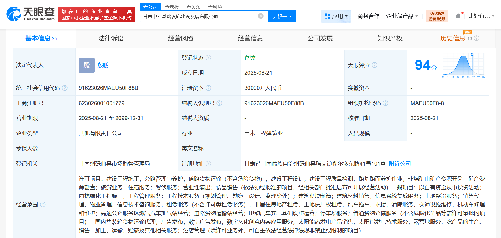 天眼查工商信息显示,近日,甘肃中建基础设施建设发展有限公司成立,法定代表人为殷鹏,注册资本3亿人民币,经营范围含建设工程施工、公路管理与养护、道路货物运输、旅游业务、以自有资金从事投资活动、园林绿化工程施工、工程管理服务、工程技术服务等。股东信息显示,该公司由中国建筑(601668)及旗下中国建设基础设施有限公司、中国建筑一局(集团)有限公司以及甘肃省交通投资管理有限公司等共同持股。