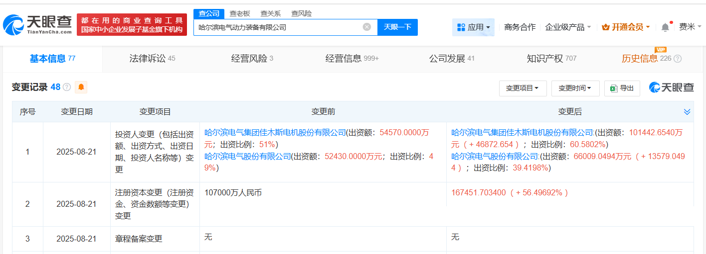 天眼查工商信息显示,近日,哈尔滨电气动力装备有限公司发生工商变更,注册资本由10.7亿人民币增至约16.7亿人民币,增幅约56%。