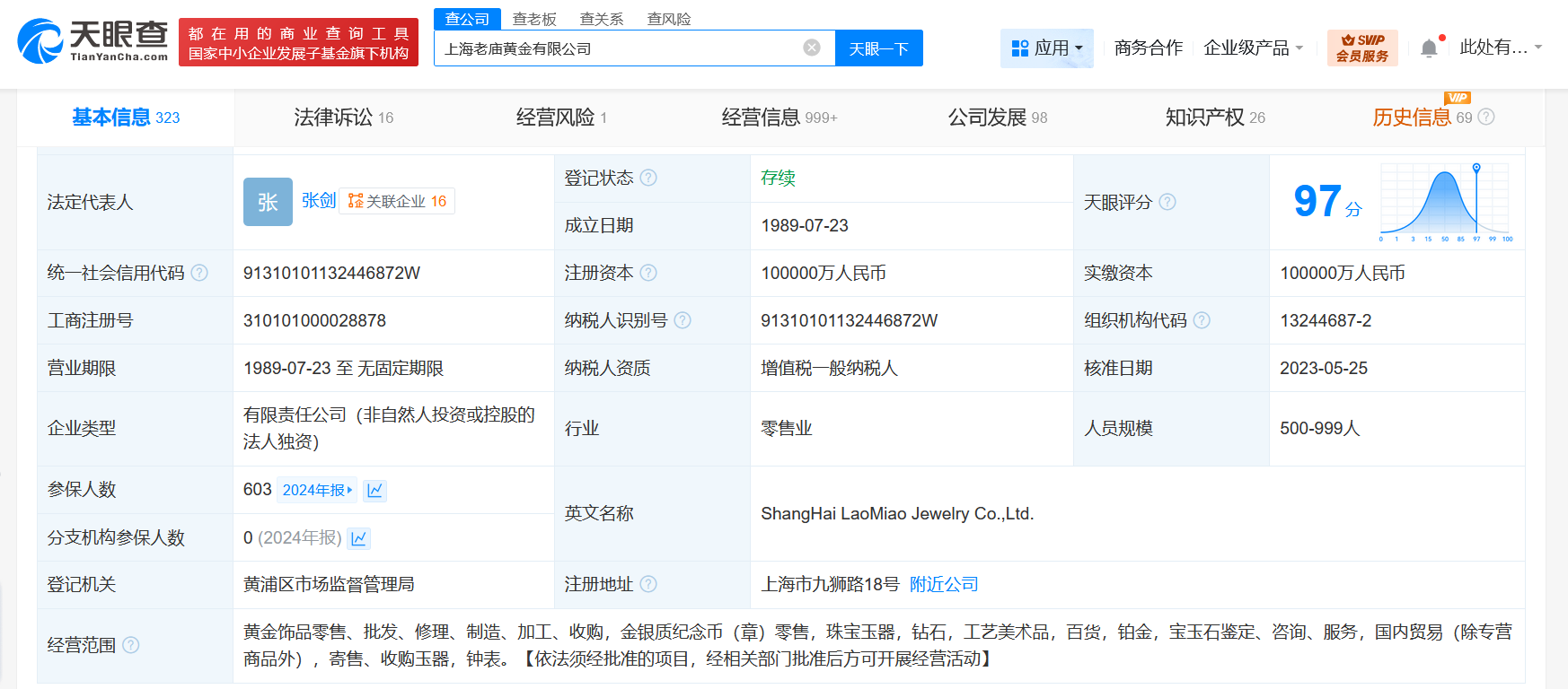 天眼查工商信息显示,老庙黄金关联公司上海老庙黄金有限公司成立于1989年7月,法定代表人为张剑,注册资本10亿人民币,经营范围含黄金饰品零售、批发、修理、制造、加工、收购,金银质纪念币(章)零售,珠宝玉器,钻石,工艺美术品,百货,铂金,宝玉石鉴定、咨询、服务等。股东信息显示,该公司由上海豫园珠宝时尚集团有限公司全资持股。对外投资信息显示,该公司直接持股50家企业,其中17家企业为存续状态,包括上海豫园黄金投资有限公司、上海黄金交易所、上海老庙黄金销售有限公司等。风险信息显示,该公司涉及多起诉讼案件,案由包括著作权权属、侵权纠纷,侵害作品复制权纠纷,侵害商标权纠纷等。