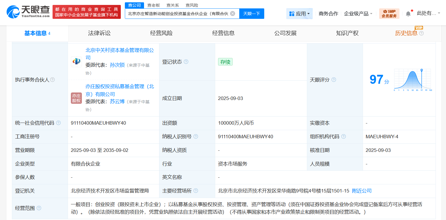 天眼查工商信息显示,近日,北京亦庄智造新动能创业投资基金合伙企业(有限合伙)成立,执行事务合伙人为北京中关村资本基金管理有限公司、亦庄股权投资私募基金管理(北京)有限公司,出资额10亿人民币,经营范围含创业投资,以私募基金从事股权投资、投资管理、资产管理等活动。合伙人信息显示,该基金由北京中关村资本基金管理有限公司、北京亦庄汽车科技发展有限公司、北京亦庄投资有限公司、亦庄股权投资私募基金管理(北京)有限公司共同出资。