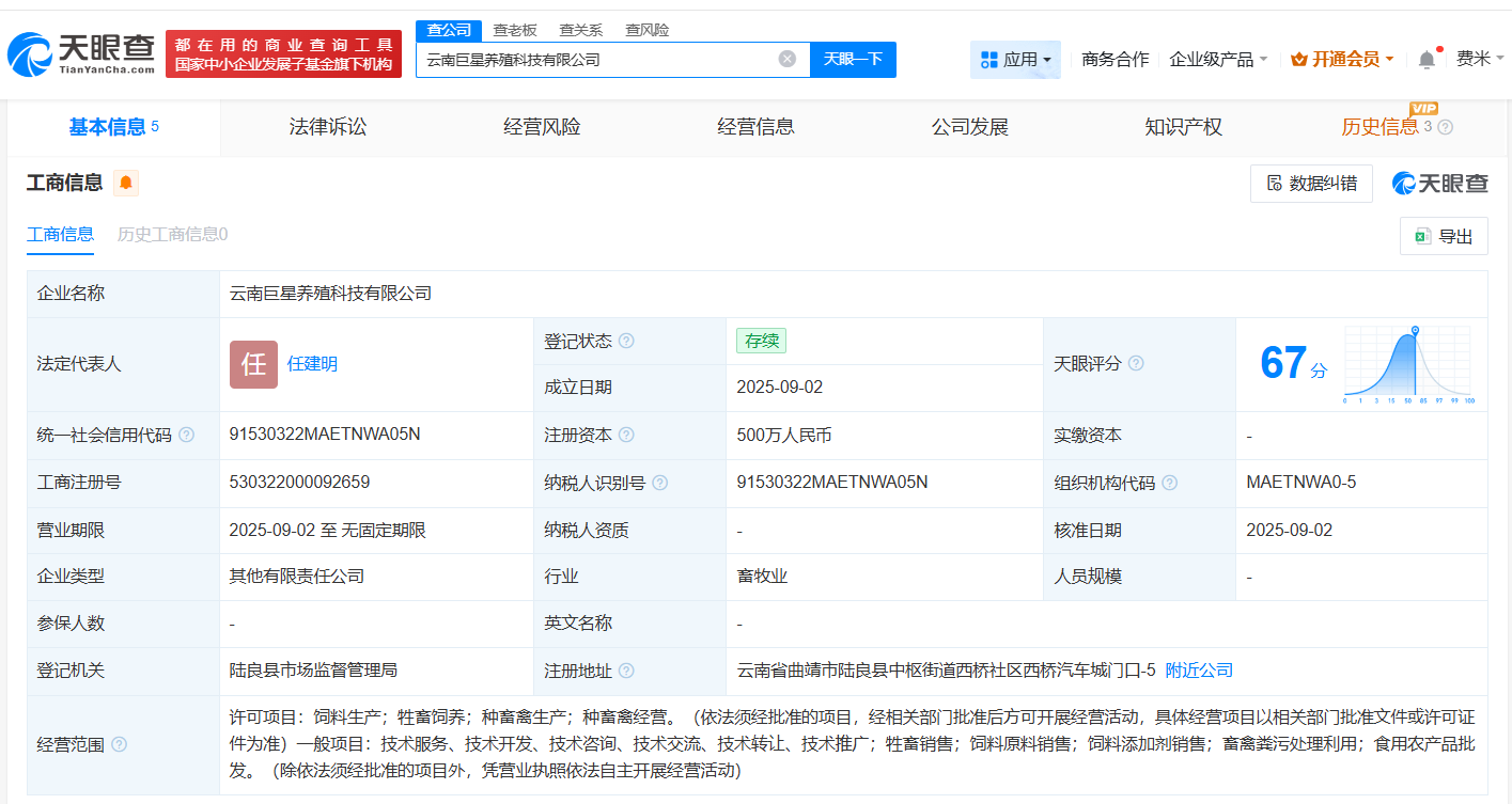 天眼查工商信息显示,近日,云南巨星养殖科技有限公司成立,法定代表人为任建明,注册资本500万人民币,经营范围包括饲料生产、牲畜饲养、种畜禽生产等。股东信息显示,该公司由巨星农牧(603477)全资持股。