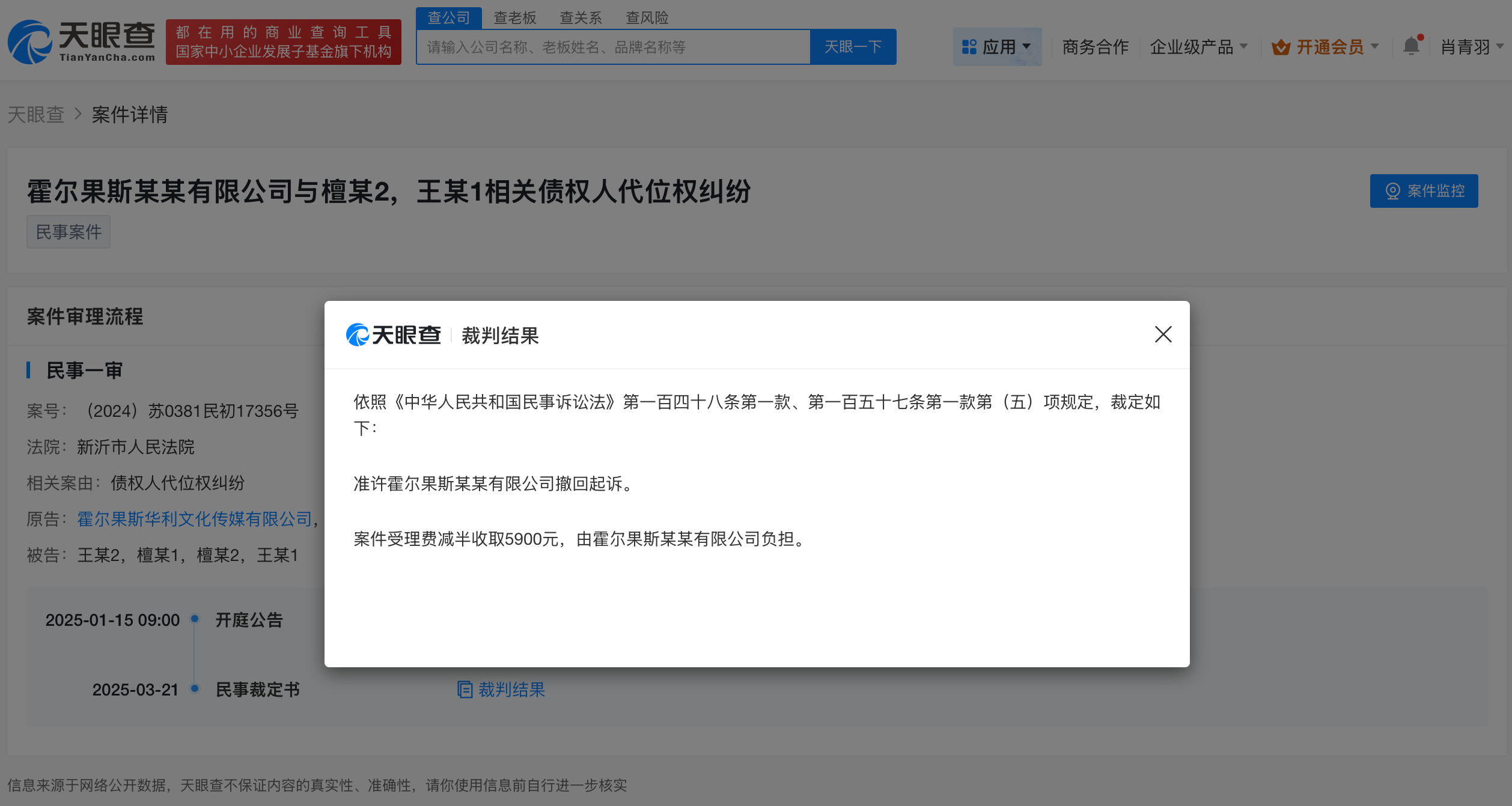 天眼查app显示,近日,霍尔果斯华利文化传媒有限公司与檀健次等债权人代位权纠纷裁判文书公布。文书信息显示,原告自愿提出撤诉申请,符合法律规定,应予准许。