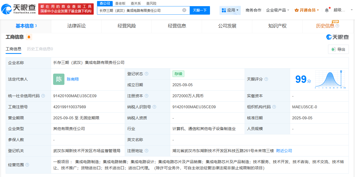 天眼查工商信息显示,近日,长存三期(武汉)集成电路有限责任公司成立,法定代表人为陈南翔,注册资本207.2亿人民币,经营范围包括集成电路制造、集成电路销售、集成电路设计、集成电路芯片及产品销售等。股东信息显示,该公司由长江存储科技有限责任公司、湖北长晟三期投资发展有限责任公司共同持股。