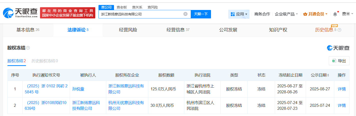 天眼查天眼风险信息显示,近日,浙江新扬意远科技有限公司新增一则股权冻结信息,被执行人为孙悦童(网红多肉饱饱),冻结股权数额为125万人民币,冻结期限为三年,执行法院为浙江省杭州市上城区人民法院。