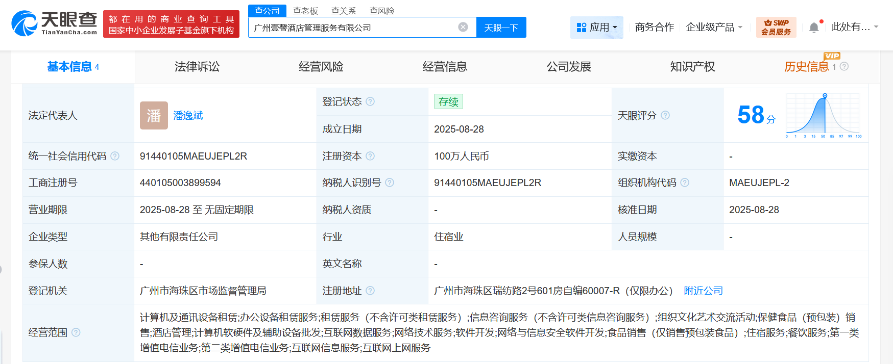 天眼查工商信息显示,近日,广州壹馨酒店管理服务有限公司成立,法定代表人为潘逸斌,注册资本100万人民币,经营范围含计算机及通讯设备租赁、办公设备租赁服务、租赁服务、信息咨询服务、组织文化艺术交流活动、酒店管理、计算机软硬件及辅助设备批发、互联网数据服务等。股东信息显示,该公司由edg关联公司上海阳川电子科技有限公司以及陕西绿树网络文化传播股份有限公司分别持股51%、49%。