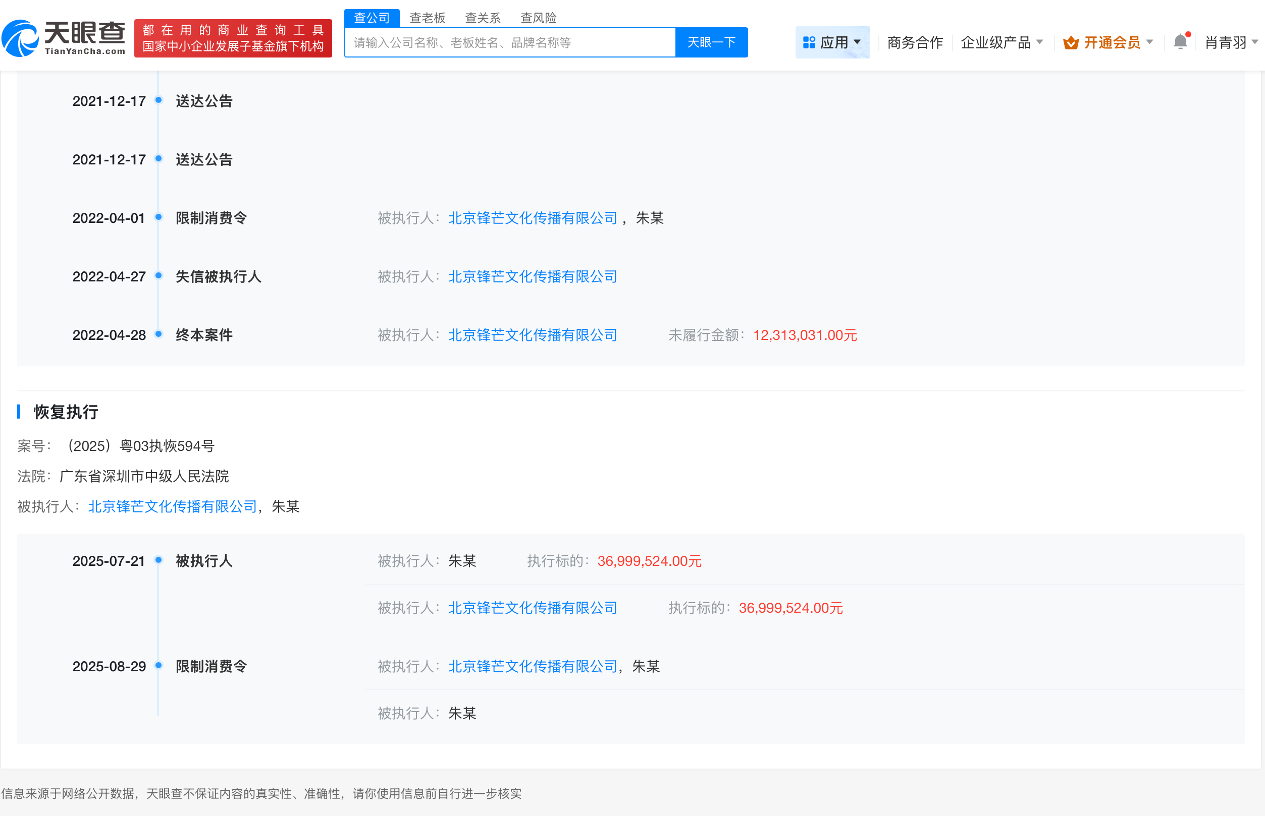 天眼查天眼风险信息显示,近日,朱文娇(柴鸡蛋)及北京锋芒文化传播有限公司新增一则限制消费令,涉及深圳市腾讯计算机系统有限公司与北京锋芒文化传播有限公司相关著作权许可使用合同纠纷案件,执行法院为广东省深圳市中级人民法院。案件流程信息显示,今年7月,朱文娇及北京锋芒文化传播有限公司已因此案被恢复执行3699.9万元。