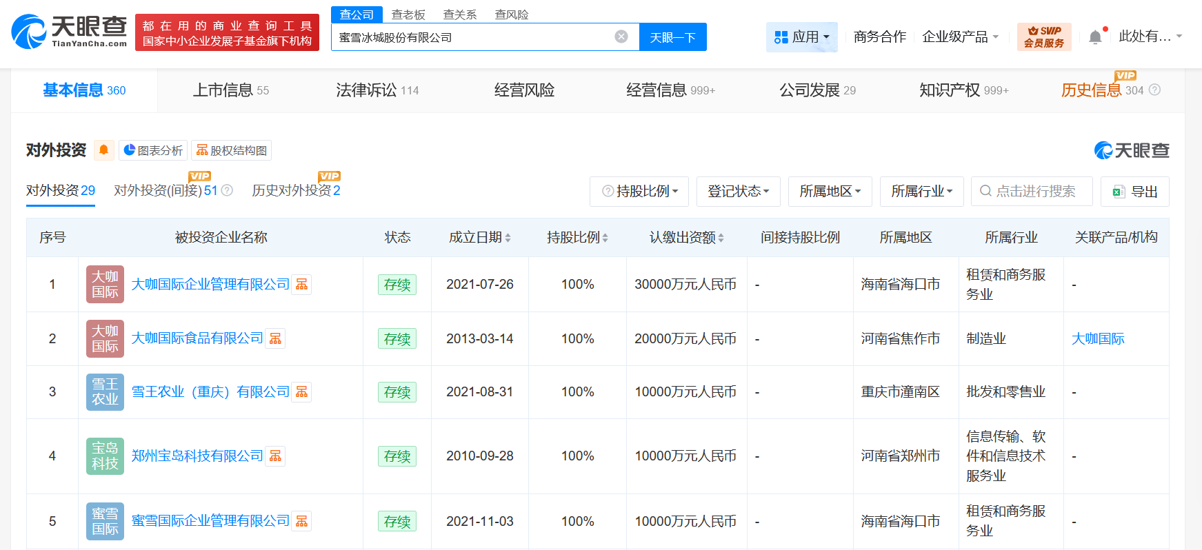天眼查工商信息显示,蜜雪集团(02097.hk)成立于2008年4月,法定代表人为张红甫,注册资本3.6亿人民币,经营范围含第二类增值电信业务、餐饮服务、企业管理咨询、市场营销策划、企业形象策划、会议及展览服务、食品互联网销售、非居住房地产租赁等。股东信息显示,该公司由张红甫、张红超、海南万店盈利投资合伙企业(有限合伙)等共同持股。对外投资信息显示,该公司直接持股近30家企业,其中20余家为存续状态,包括雪王农业(重庆)有限公司、大咖国际企业管理有限公司、河南幸运咖餐饮管理有限公司等,版图涉及餐饮、文化娱乐、科技等。