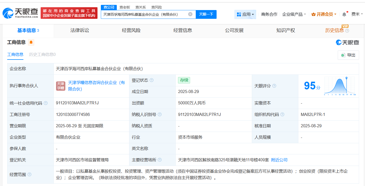天眼查工商信息显示,近日,天津百孚海河西岸私募基金合伙企业(有限合伙)成立,执行事务合伙人为天津孚瞳信息咨询合伙企业(有限合伙),出资额5亿人民币,经营范围为以私募基金从事股权投资、投资管理、资产管理等活动。合伙人信息显示,该基金由天津市桂发祥麻花饮食集团有限公司、天津市海河产业基金合伙企业(有限合伙)、天津孚瞳信息咨询合伙企业(有限合伙)共同出资。