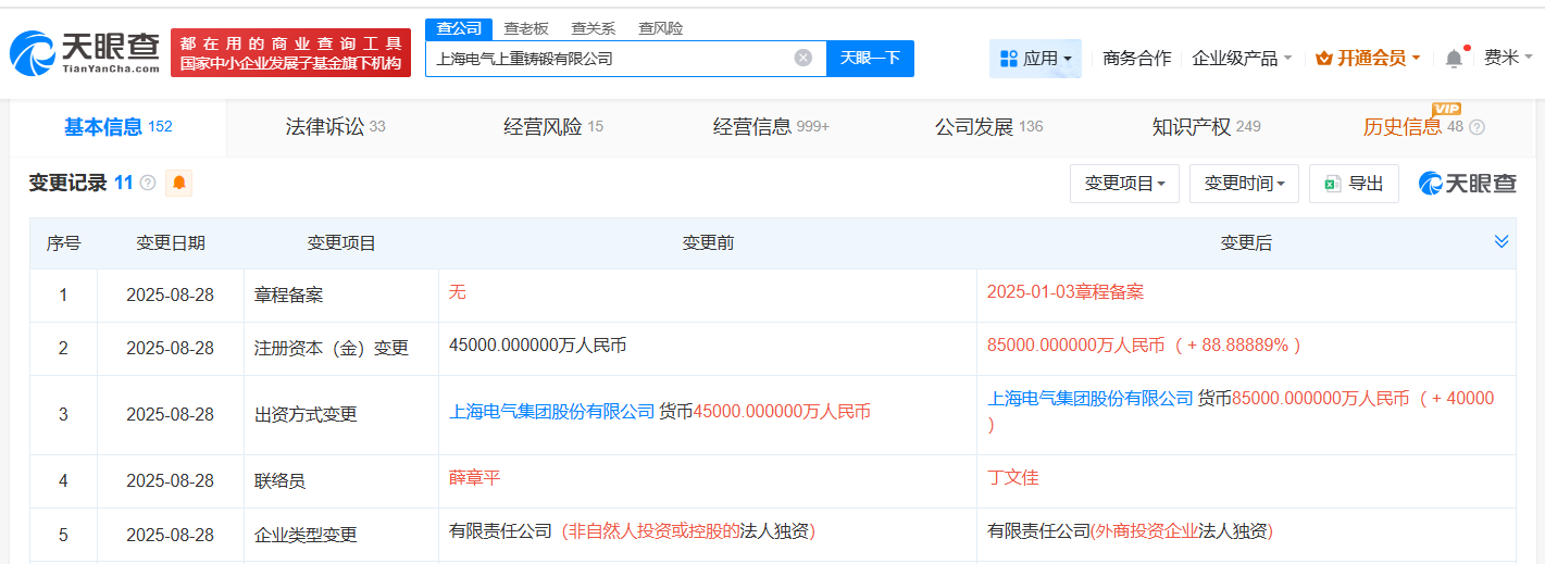 天眼查工商信息显示,近日,上海电气上重铸锻有限公司发生工商变更,注册资本由4.5亿增至8.5亿人民币,增幅约89%。