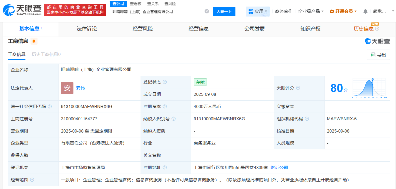 天眼查工商信息显示,近日,呷哺呷哺(上海)企业管理有限公司成立,法定代表人为安伟,注册资本4000万人民币,经营范围包括企业管理、企业管理咨询、信息咨询服务。股东信息显示,该公司由呷哺呷哺投资集团有限公司全资持股。