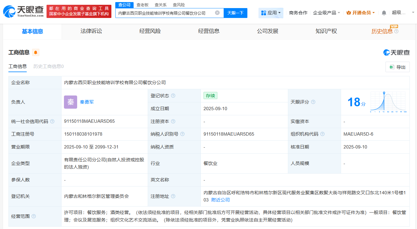 天眼查工商信息显示,近日,内蒙古西贝职业技能培训学校有限公司餐饮分公司成立,负责人为秦勇军,经营范围为餐饮服务、酒类经营等。内蒙古西贝职业技能培训学校有限公司则成立于今年5月,注册资本500万人民币,经营范围包括营利性民办职业技能培训机构、餐饮服务等,由内蒙古西贝餐饮集团有限公司全资持股。主要人员信息显示,贾国龙为该公司董事。