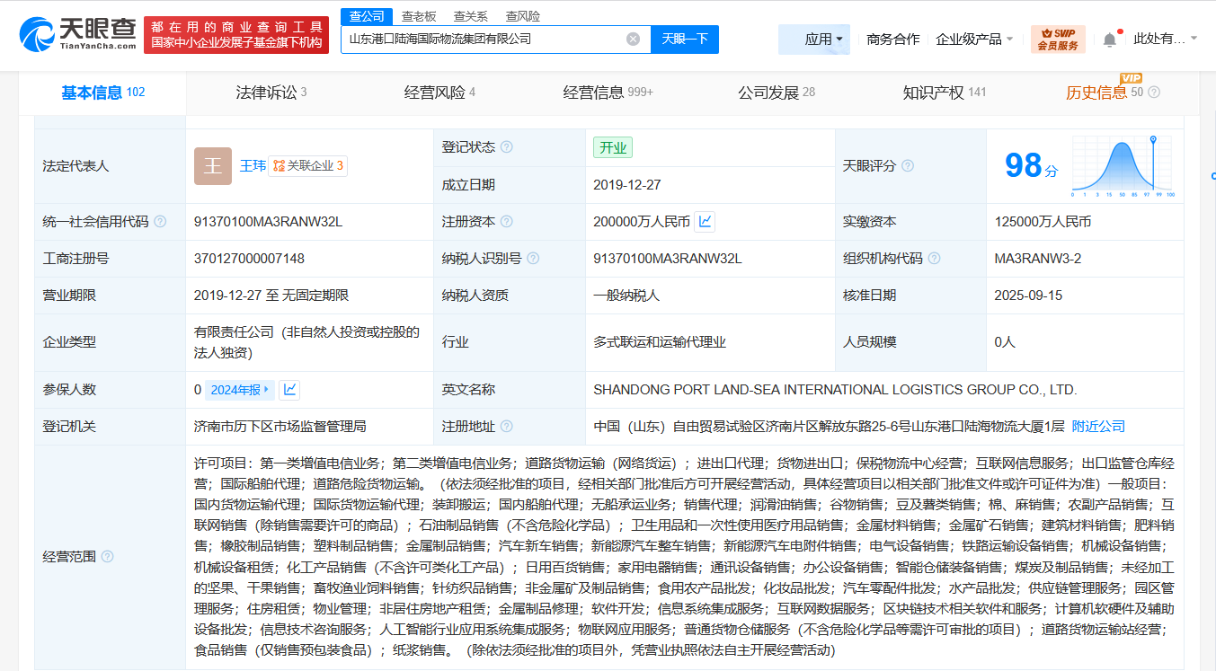 天眼查app显示,近日,山东港口陆海国际物流集团有限公司发生工商变更,注册资本由12.5亿人民币增至20亿人民币,增幅60%。