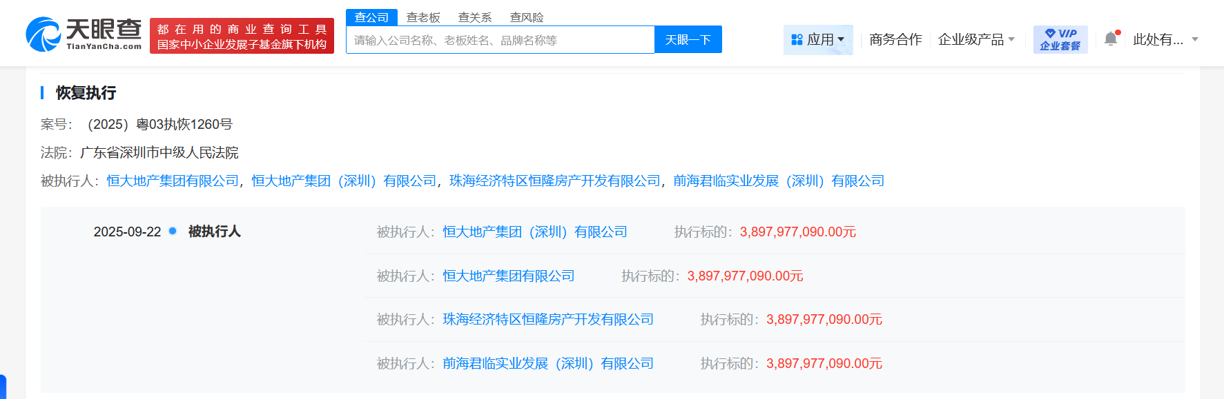 天眼查app显示,近日,恒大地产集团有限公司、恒大地产集团(深圳)有限公司、珠海经济特区恒隆房产开发有限公司等新增一则恢复执行信息,执行标的38.9亿余元,执行法院为广东省深圳市中级人民法院。
