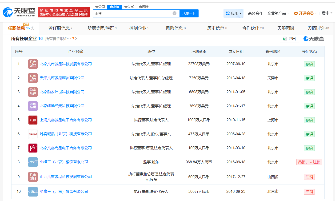 天眼查app显示,陈年(原名王玮)名下关联16家企业,其中7家处于存续状态,分别是凡客诚品(北京)科技有限公司、北京凡客尚品电子商务有限公司、北京纬地经天科技有限公司等,陈年在上述公司担任法定代表人、执行董事等职务,其余9家企业已注销或被吊销。