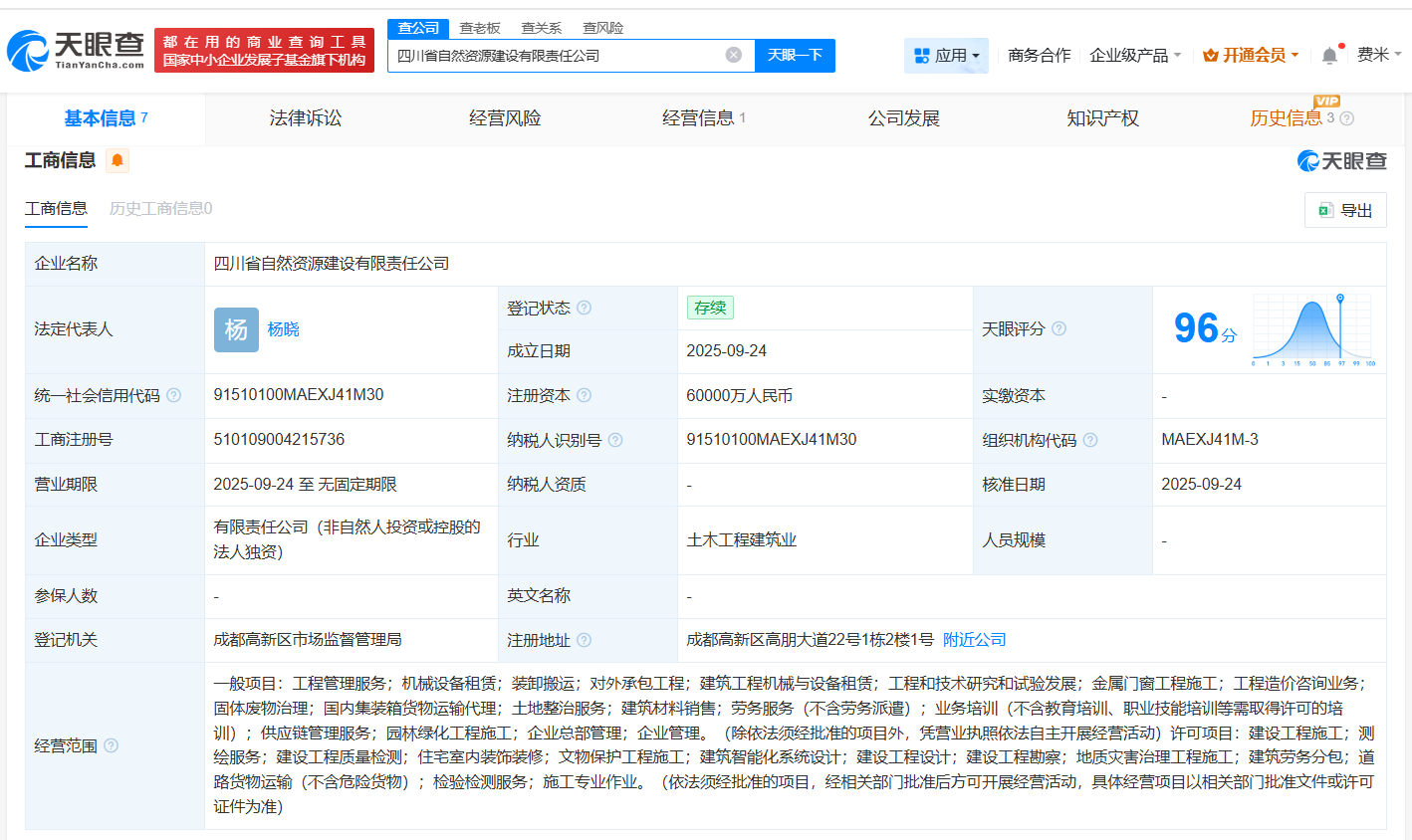 天眼查app显示,近日,四川省自然资源建设有限责任公司成立,法定代表人为杨晓,注册资本6亿人民币,经营范围包括工程管理服务、机械设备租赁、装卸搬运等。股东信息显示,该公司由四川省自然资源投资集团有限责任公司全资持股。