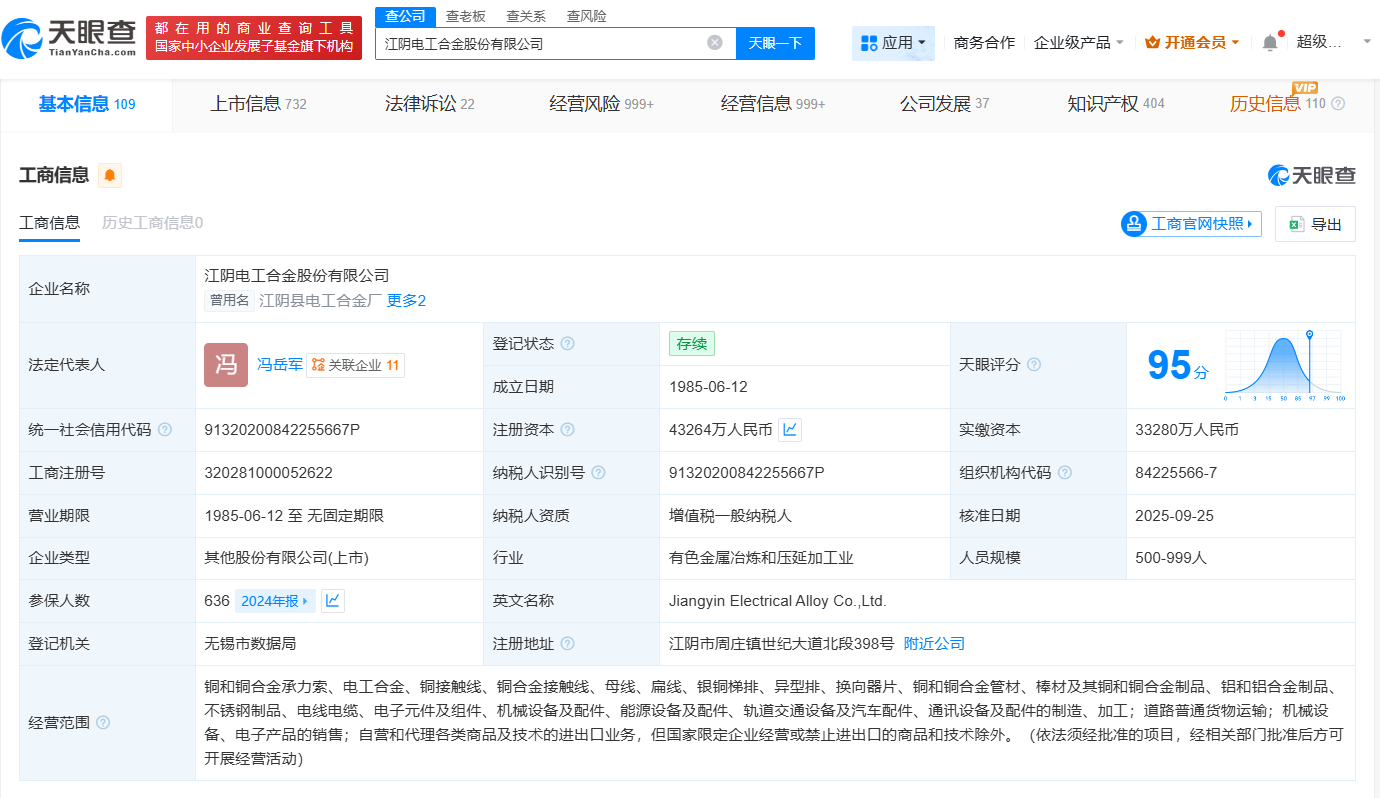 江阴电工合金股份有限公司成立于1985年6月,法定代表人为冯岳军,经营范围包括机械设备、电子产品的销售等,由陈力皎、厦门全信企业管理有限公司等共同持股。