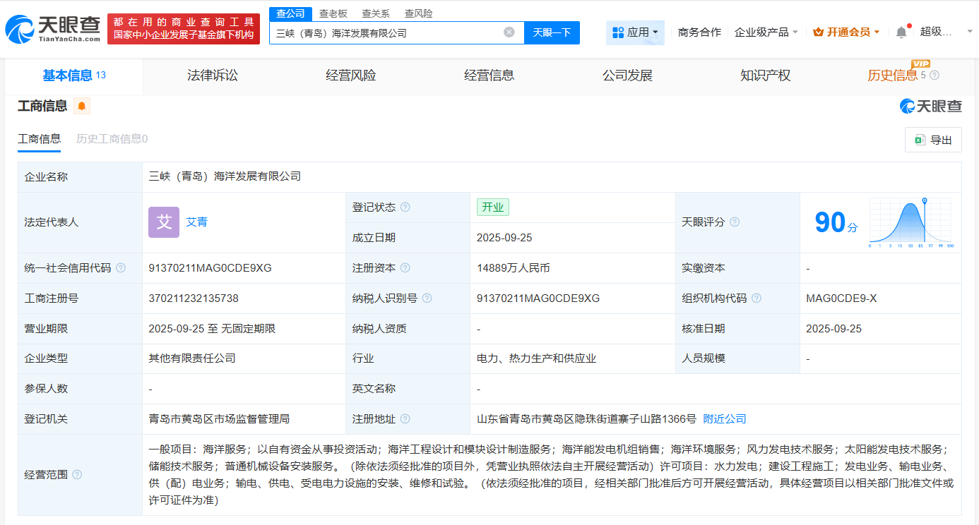 天眼查工商信息显示,近日,三峡(青岛)海洋发展有限公司成立,法定代表人为艾青,注册资本约1.49亿人民币,经营范围包括海洋服务、以自有资金从事投资活动、海洋工程设计和模块设计制造服务等。股东信息显示,该公司由三峡能源(600905)、长江三峡投资管理有限公司、汉缆股份(002498)、盘古智能(301456)等共同持股。