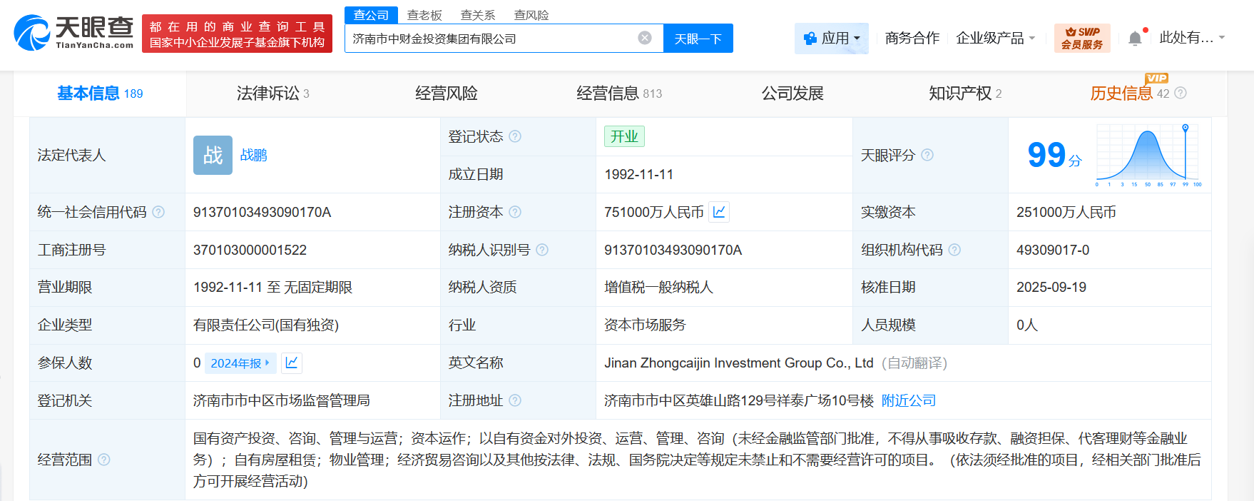 该公司成立于1992年11月,法定代表人为战鹏,经营范围含国有资产投资、咨询、管理与运营,资本运作,以自有资金对外投资、运营、管理、咨询,自有房屋租赁,物业管理等。股东信息显示,该公司由济南市市中区政府项目资金服务中心全资持股。