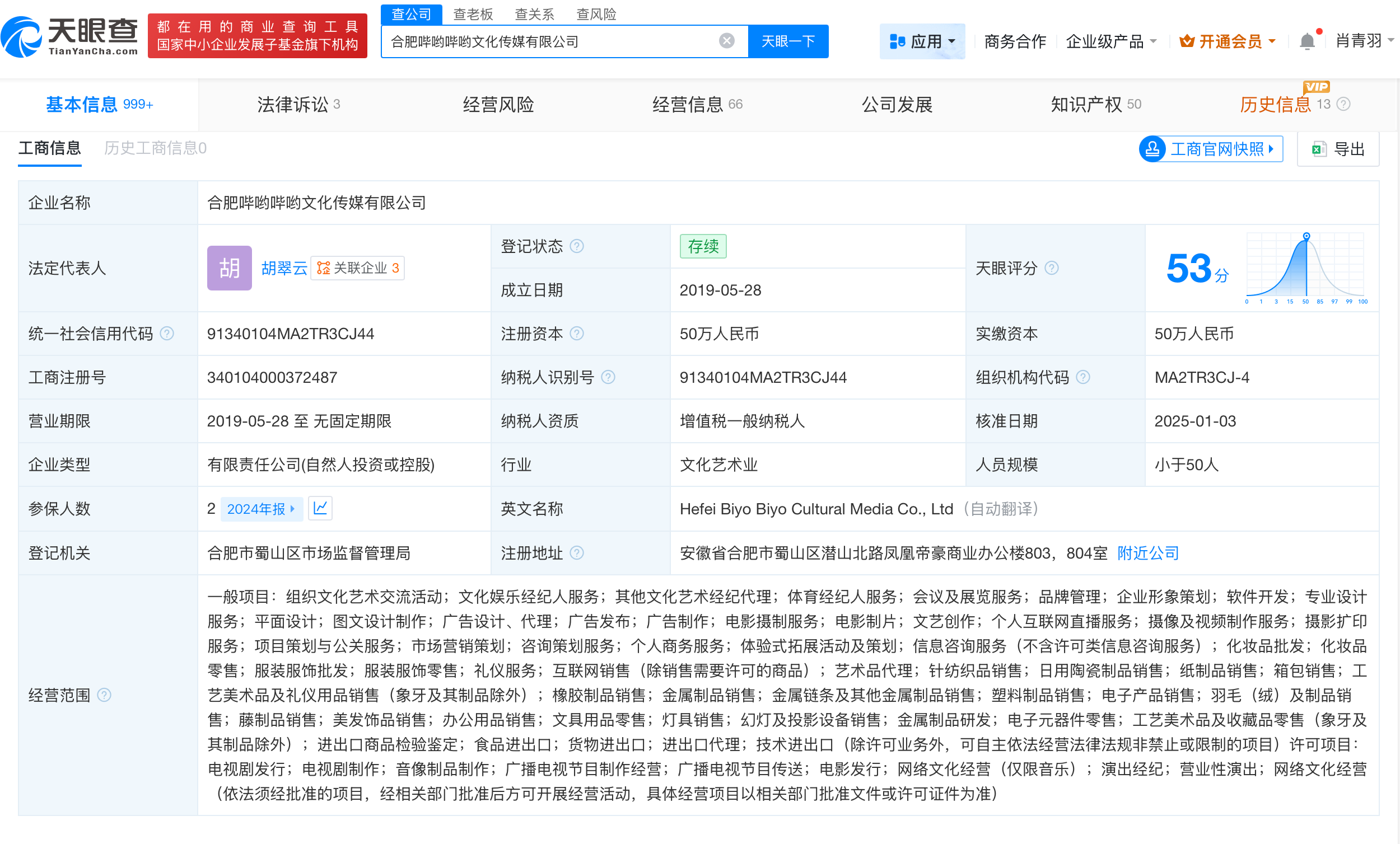 天眼查app显示,合肥哔哟哔哟文化传媒有限公司成立于2019年5月,法定代表人为胡翠云,注册资本50万人民币,经营范围包括组织文化艺术交流活动、文化娱乐经纪人服务、其他文化艺术经纪代理等,由马庆玲、卢楚麒共同持股。作品著作权信息显示,杭州叁己文化创意有限公司已登记宇宙诗人作品著作权,作品类别涉及美术。
