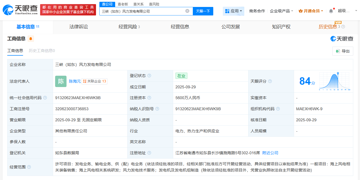 天眼查app显示,近日,三峡(如东)风力发电有限公司成立,法定代表人为陈海元,注册资本5600万人民币,经营范围包括海上风电相关装备销售、海上风电相关系统研发、风力发电技术服务等,由三峡能源(600905)、远景能源有限公司、南通能源投资发展有限公司共同持股。