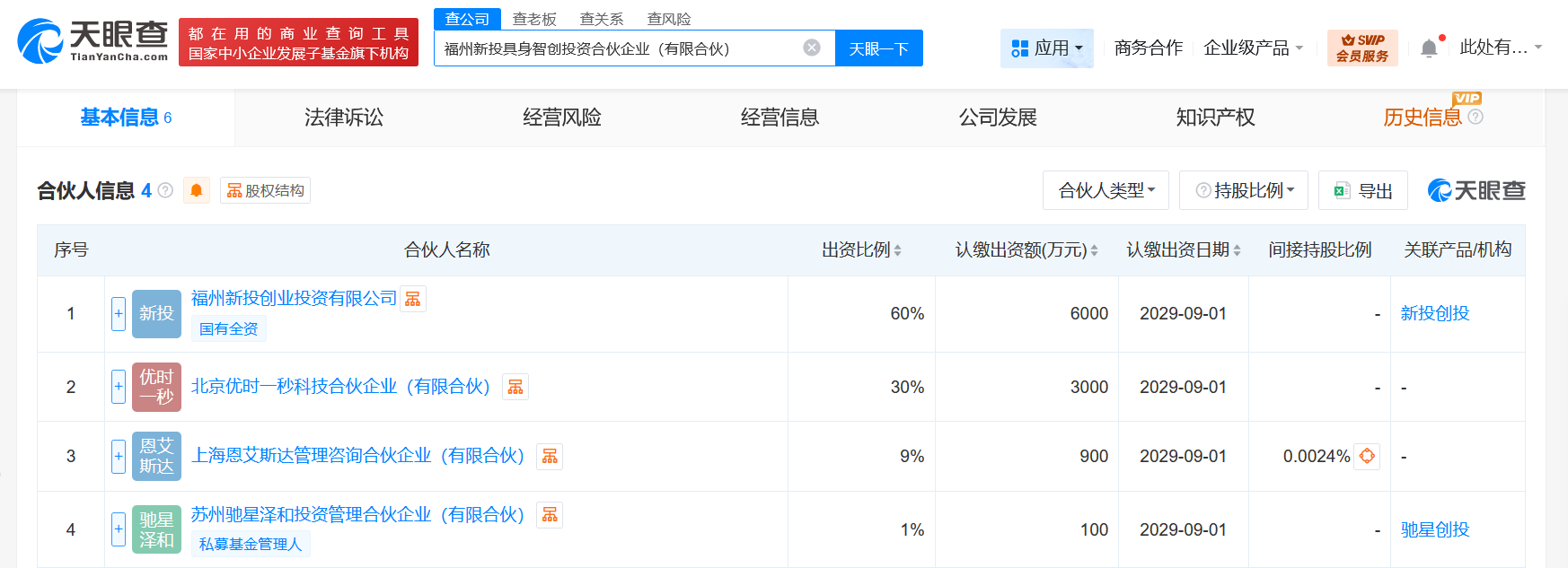 天眼查app显示,近日,福州新投具身智创投资合伙企业(有限合伙)成立,执行事务合伙人为苏州驰星泽和投资管理合伙企业(有限合伙),出资额1亿人民币,经营范围为以私募基金从事股权投资、投资管理、资产管理等活动。合伙人信息显示,该企业由福州新投创业投资有限公司、北京优时一秒科技合伙企业(有限合伙)、上海恩艾斯达管理咨询合伙企业(有限合伙)等共同出资。