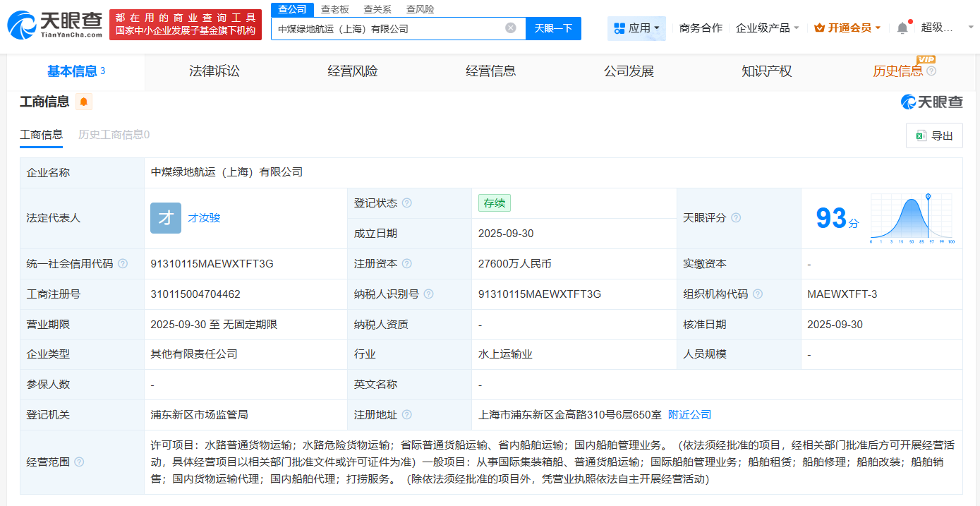 天眼查app显示,近日,中煤绿地航运(上海)有限公司成立,法定代表人为才汝骏,注册资本2.76亿人民币,经营范围包括水路普通货物运输、水路危险货物运输、国内船舶管理业务等,由中煤物流(秦皇岛)有限公司、上海绿地能源集团航运有限公司共同持股。