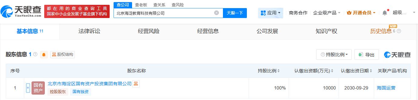 天眼查app显示,近日,北京海淀教育科技有限公司成立,法定代表人为王腾,注册资本1亿人民币,经营范围包括教育咨询服务、企业管理等,由北京市海淀区国有资产投资集团有限公司全资持股。