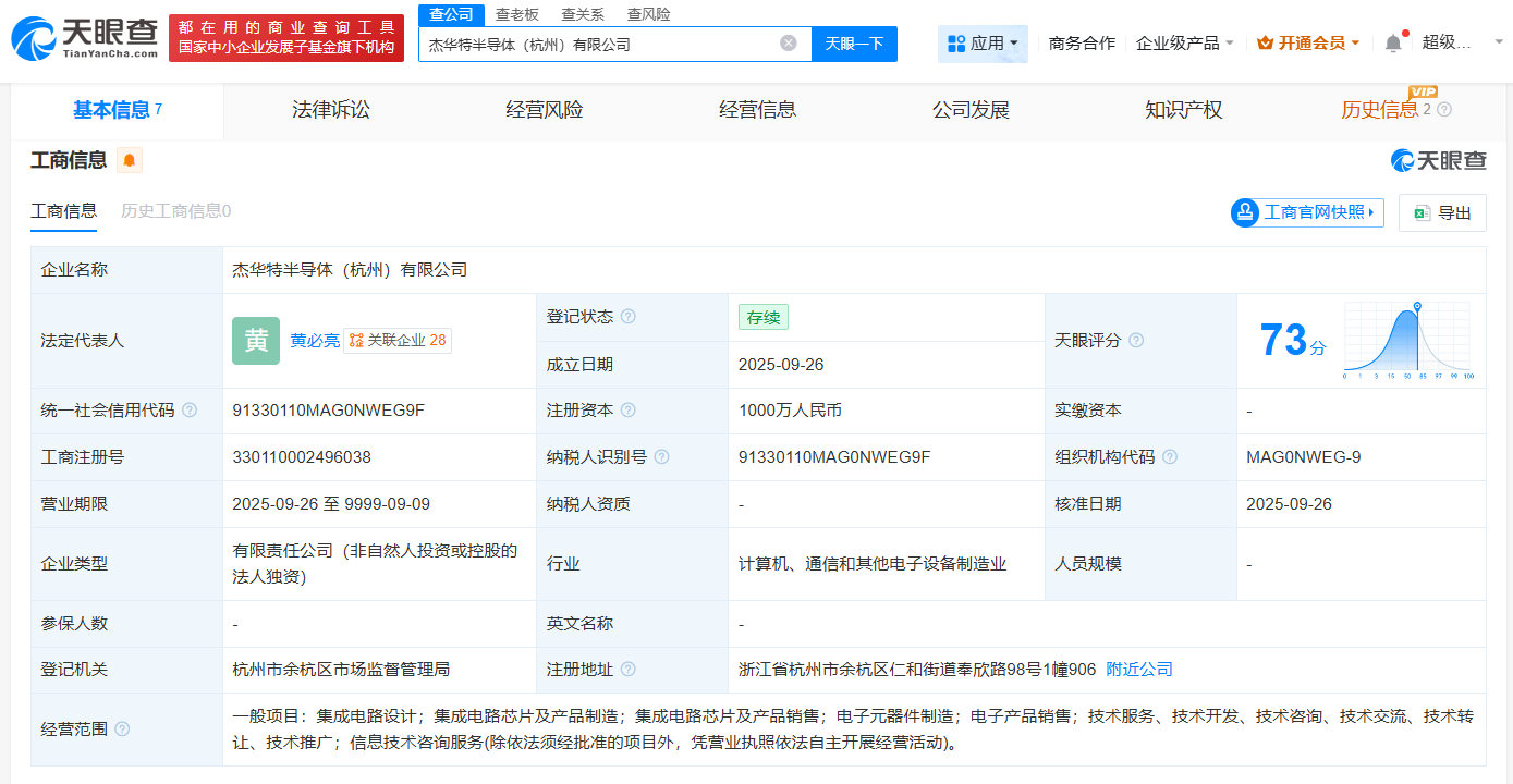 天眼查app显示,近日,杰华特半导体(杭州)有限公司成立,法定代表人为黄必亮,注册资本1000万人民币,经营范围包括集成电路设计、集成电路芯片及产品制造、集成电路芯片及产品销售等,由杰华特(688141)全资持股。